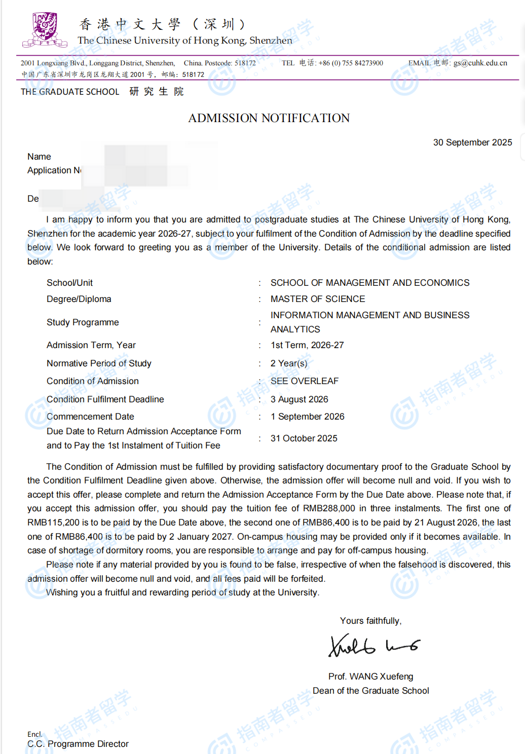 香港中文大学信息管理 & 商业分析理学硕士(CUHK-Shenzhen)研究生offer一枚