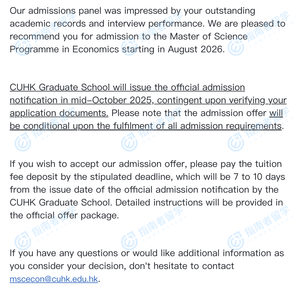 香港中文大学经济学理学硕士研究生offer一枚