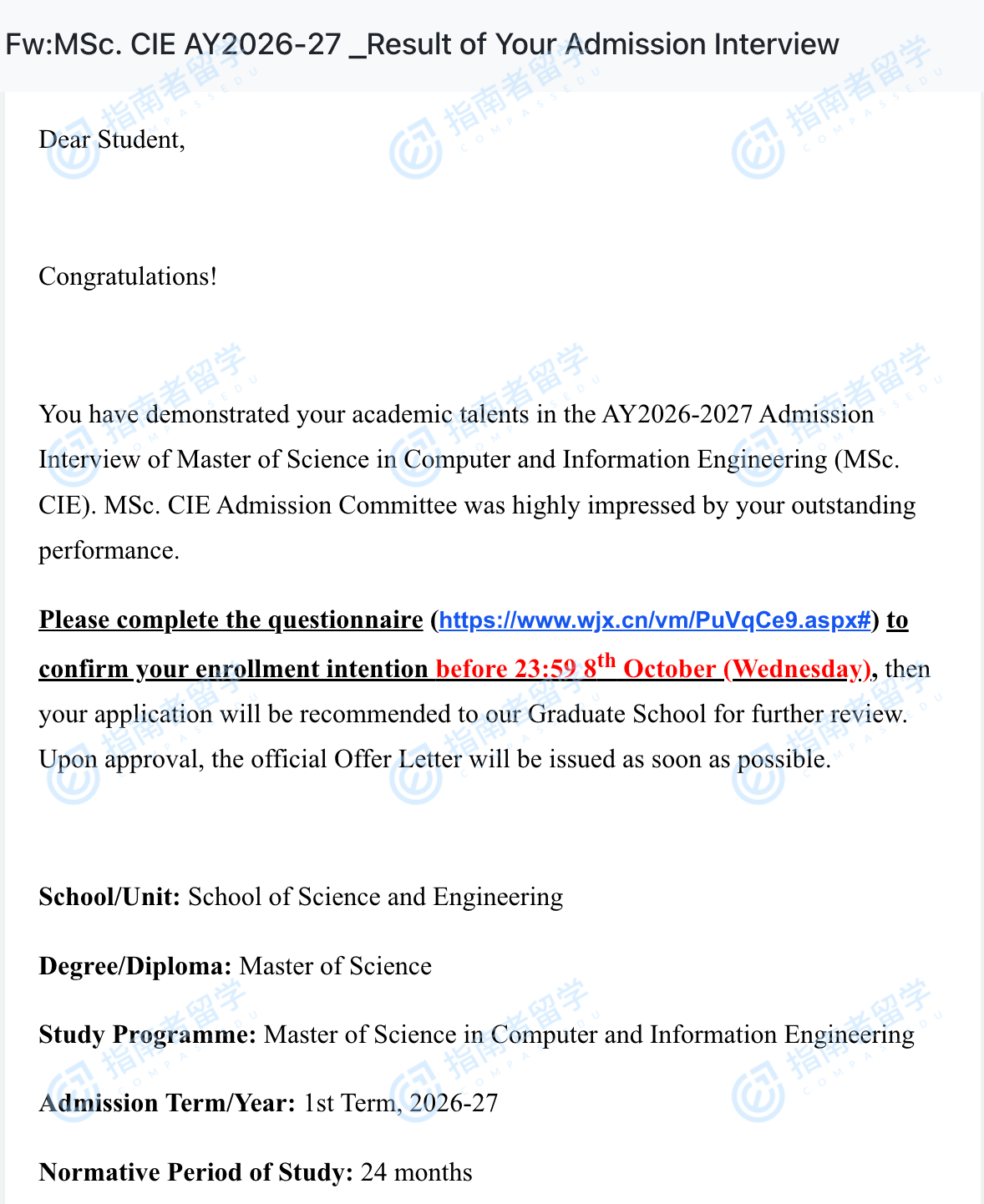 香港中文大学计算机与信息工程理学硕士(CUHK-Shenzhen)研究生offer一枚
