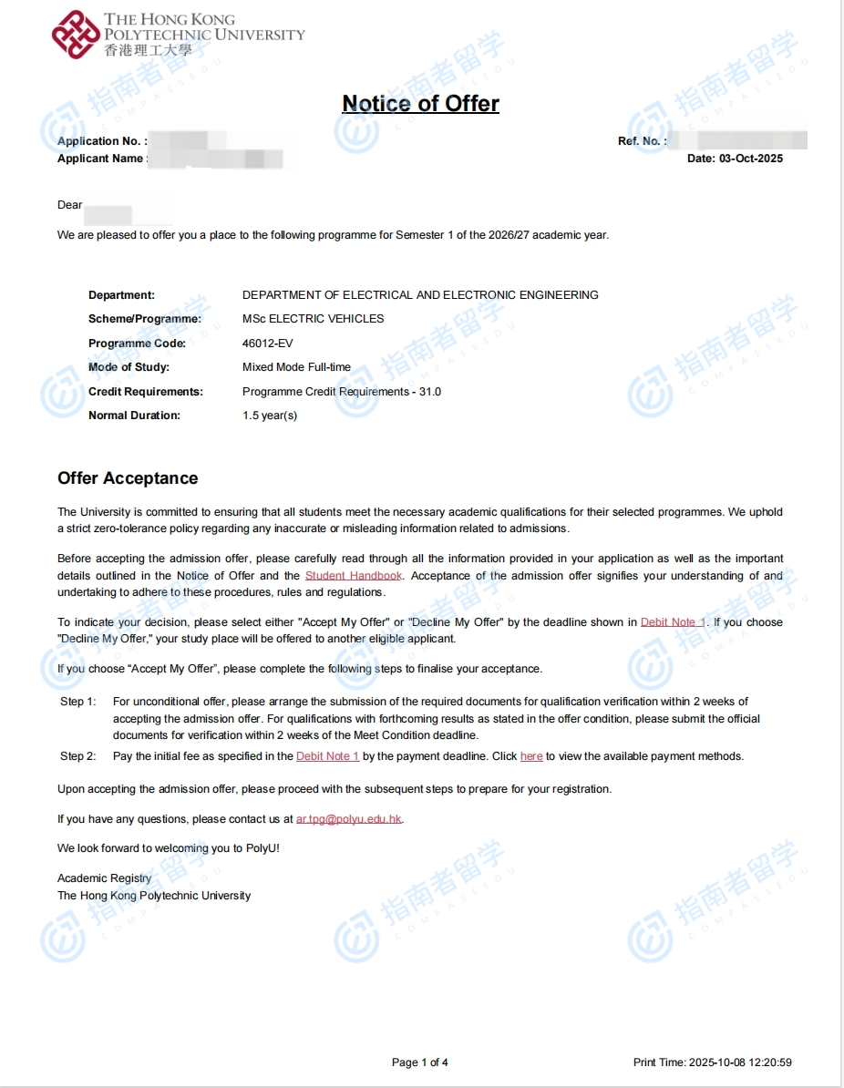 香港理工大学电动汽车理学硕士研究生offer一枚