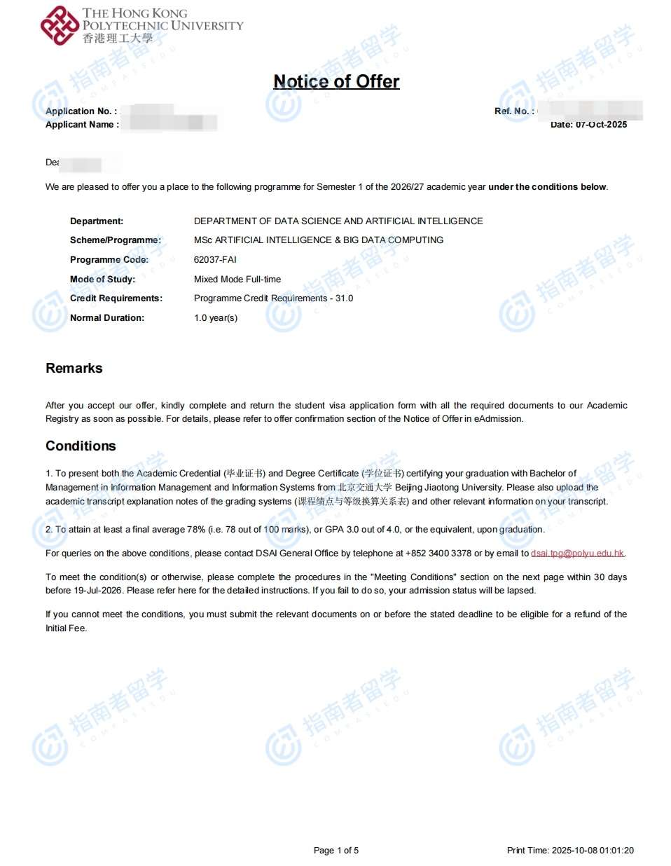 香港理工大学人工智能及大数据计算理学硕士研究生offer一枚