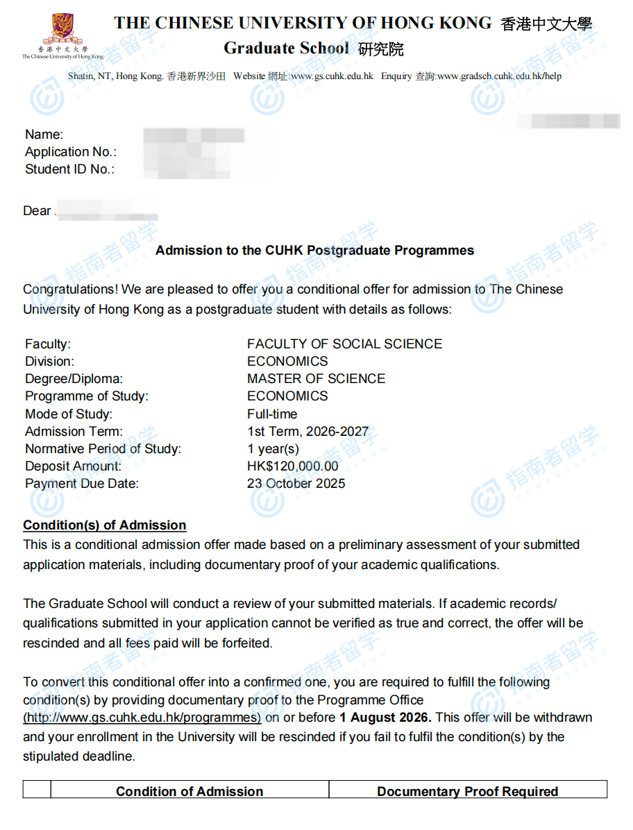 香港中文大学经济学理学硕士研究生offer一枚