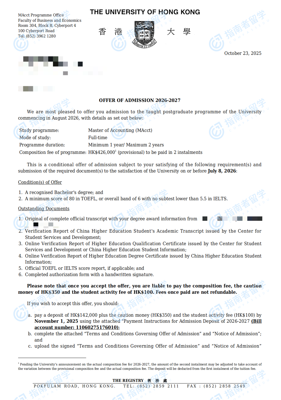 香港大学会计学硕士研究生offer一枚