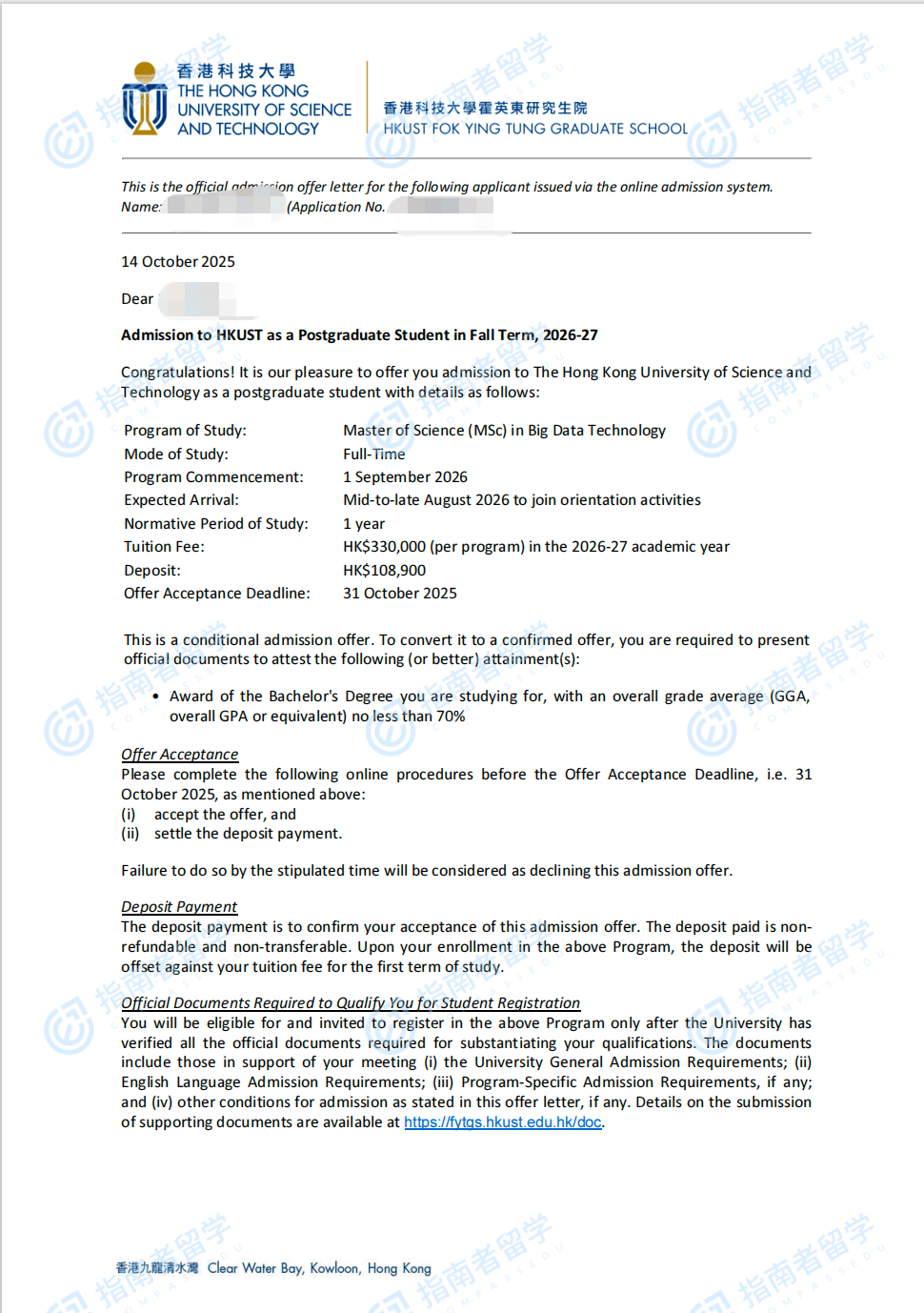 香港科技大学大数据科技理学硕士研究生offer一枚