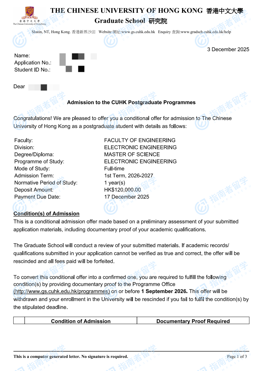香港中文大学电子工程理学硕士研究生offer一枚