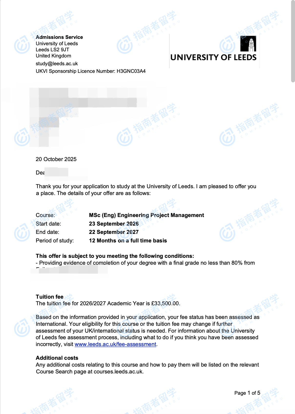 利兹大学工程项目管理(工程)理学硕士研究生offer一枚