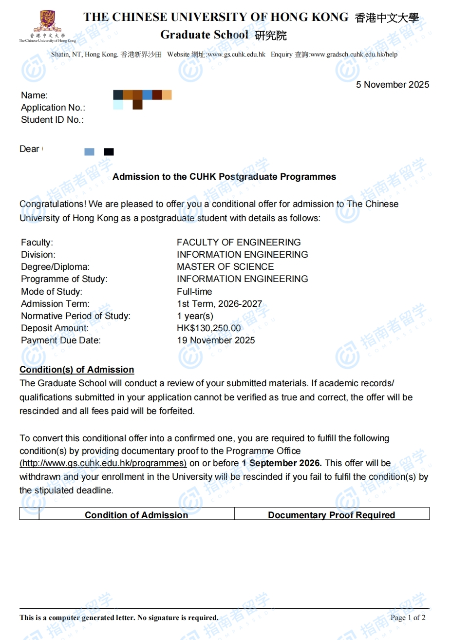 香港中文大学信息工程理学硕士研究生offer一枚