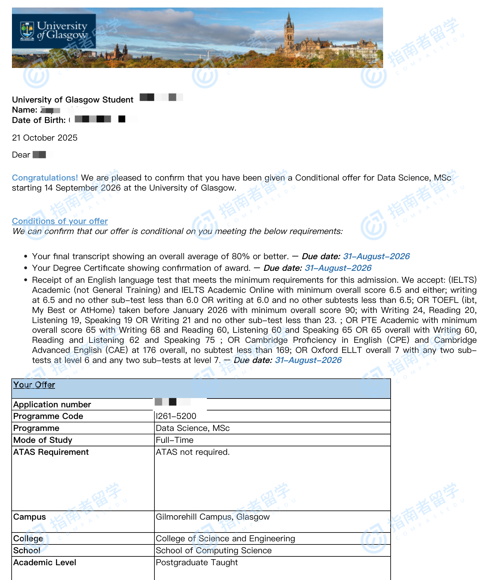 格拉斯哥大学数据科学理学硕士研究生offer一枚