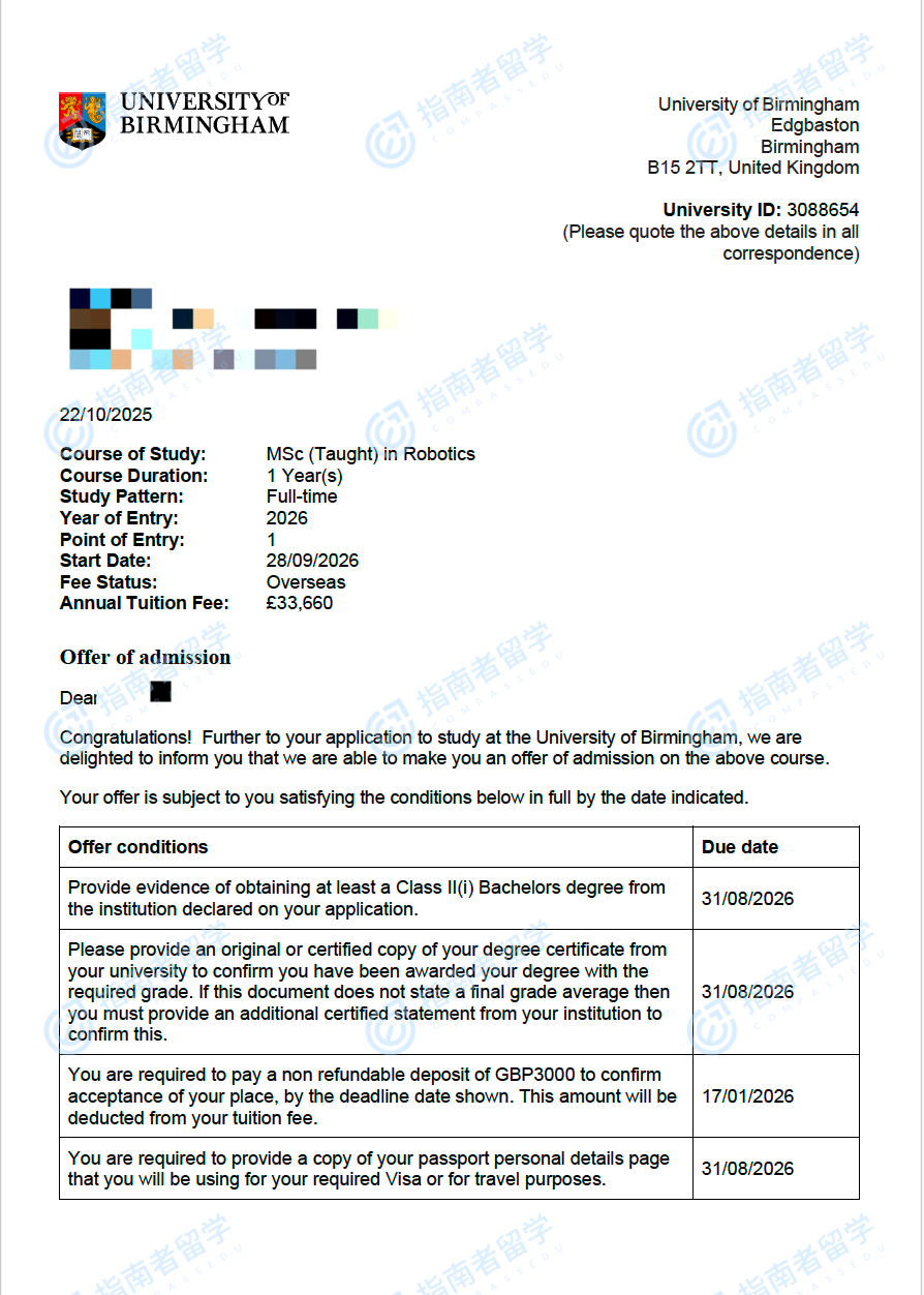 伯明翰大学机器人学理学硕士研究生offer一枚