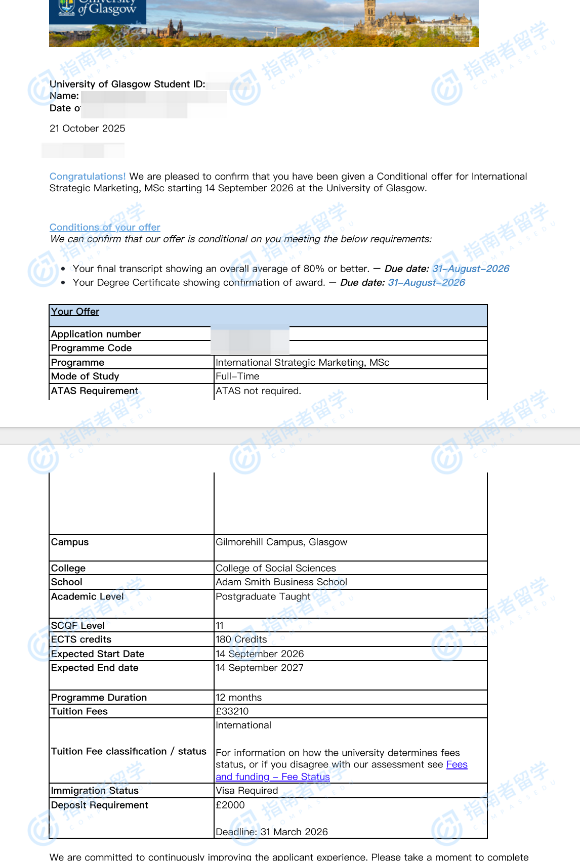 格拉斯哥大学国际战略营销理学硕士研究生offer一枚