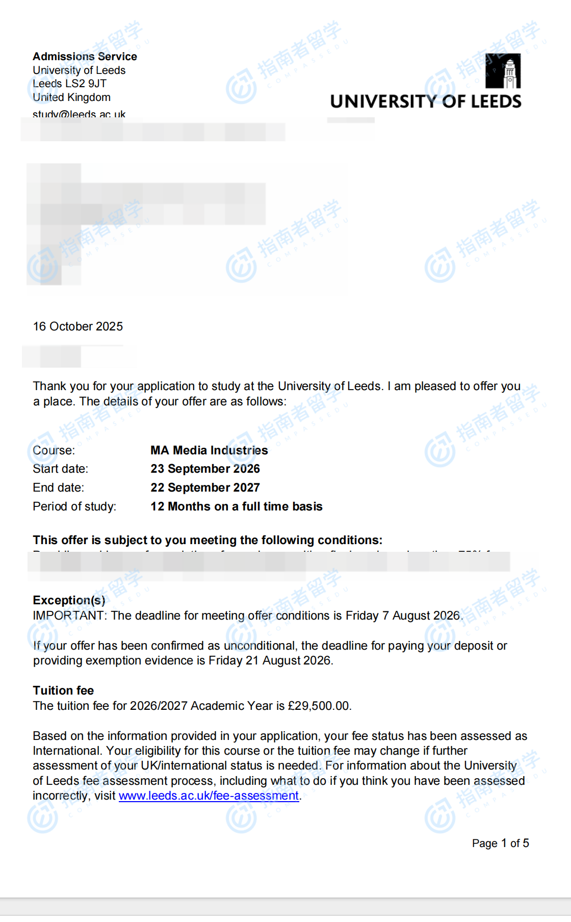 利兹大学媒体产业文学硕士研究生offer一枚