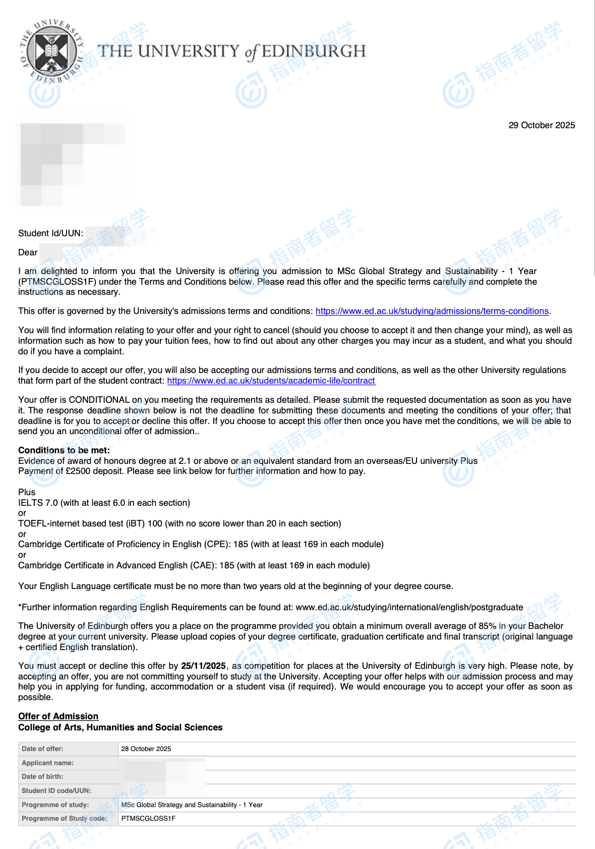 爱丁堡大学全球战略与可持续发展理学硕士研究生offer一枚