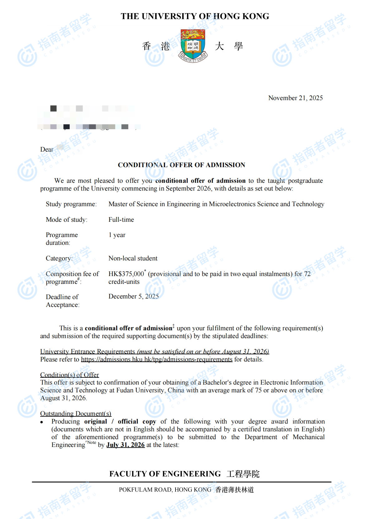 香港大学微电子科学与技术(工程)理学硕士研究生offer一枚