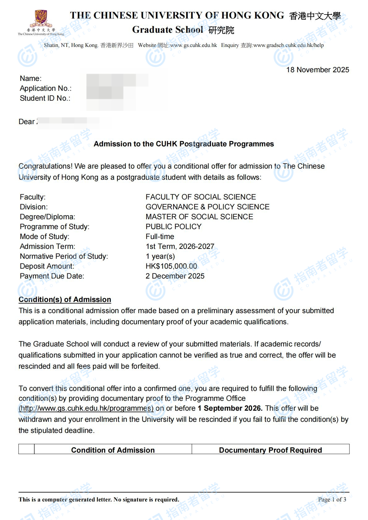香港中文大学公共政策社会科学硕士研究生offer一枚