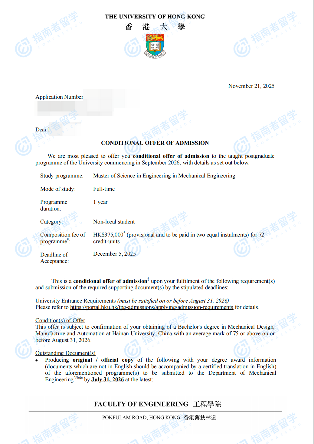 香港大学机械工程(工程)理学硕士研究生offer一枚