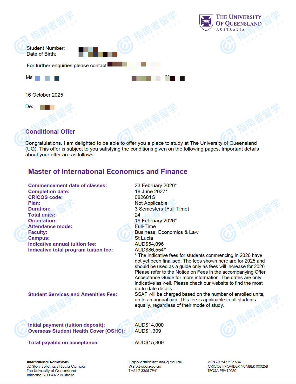 昆士兰大学国际经济与金融硕士(1.5年制)研究生offer一枚