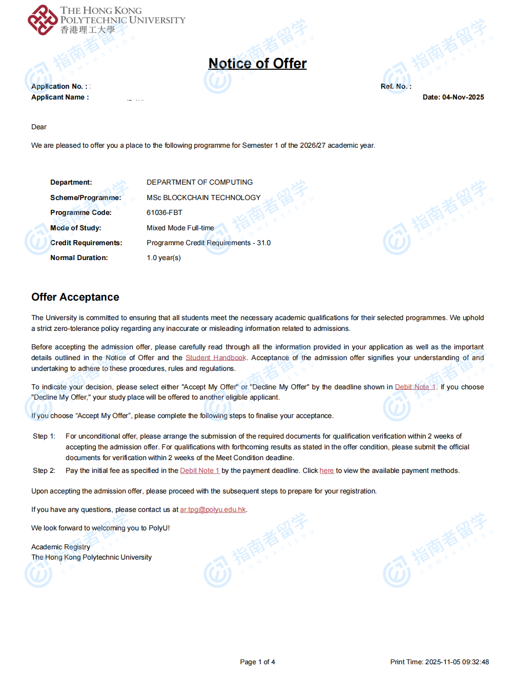 香港理工大学区块链科技理学硕士研究生offer一枚