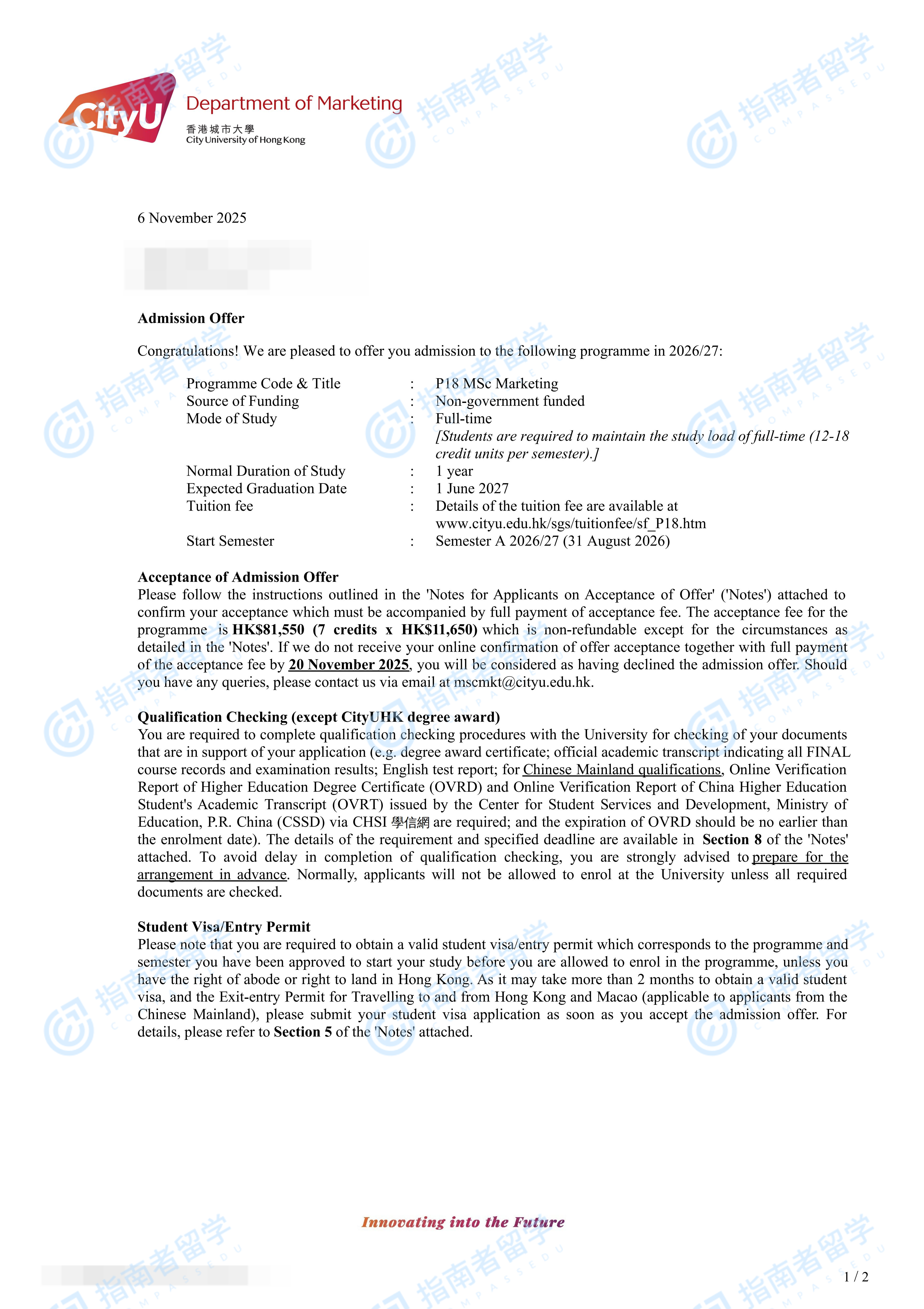 香港城市大学市场营销学理学硕士研究生offer一枚