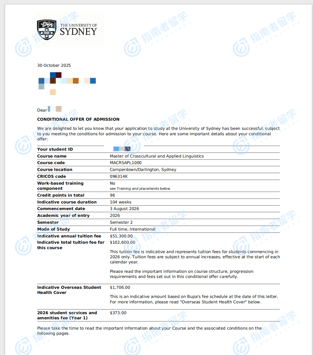 悉尼大学跨文化与应用语言学硕士研究生offer一枚