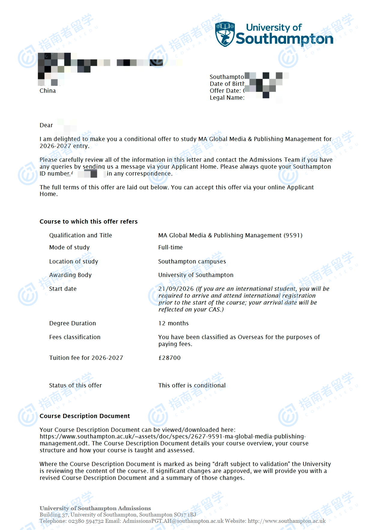南安普顿大学全球媒体与出版管理文学硕士研究生offer一枚