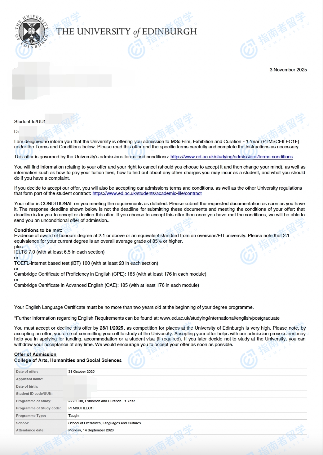 爱丁堡大学电影、展览与策展理学硕士研究生offer一枚