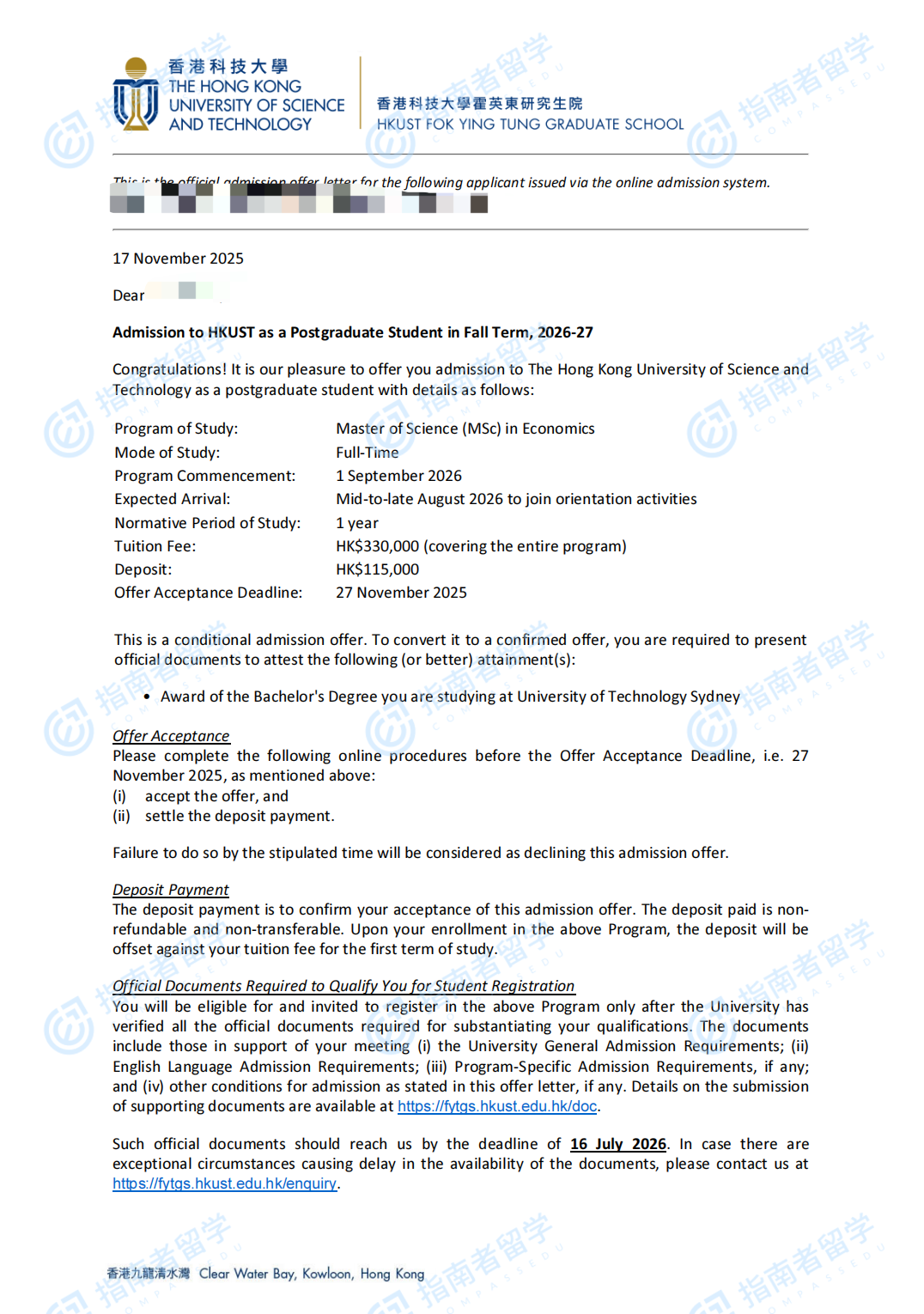 香港科技大学经济学理学硕士研究生offer一枚