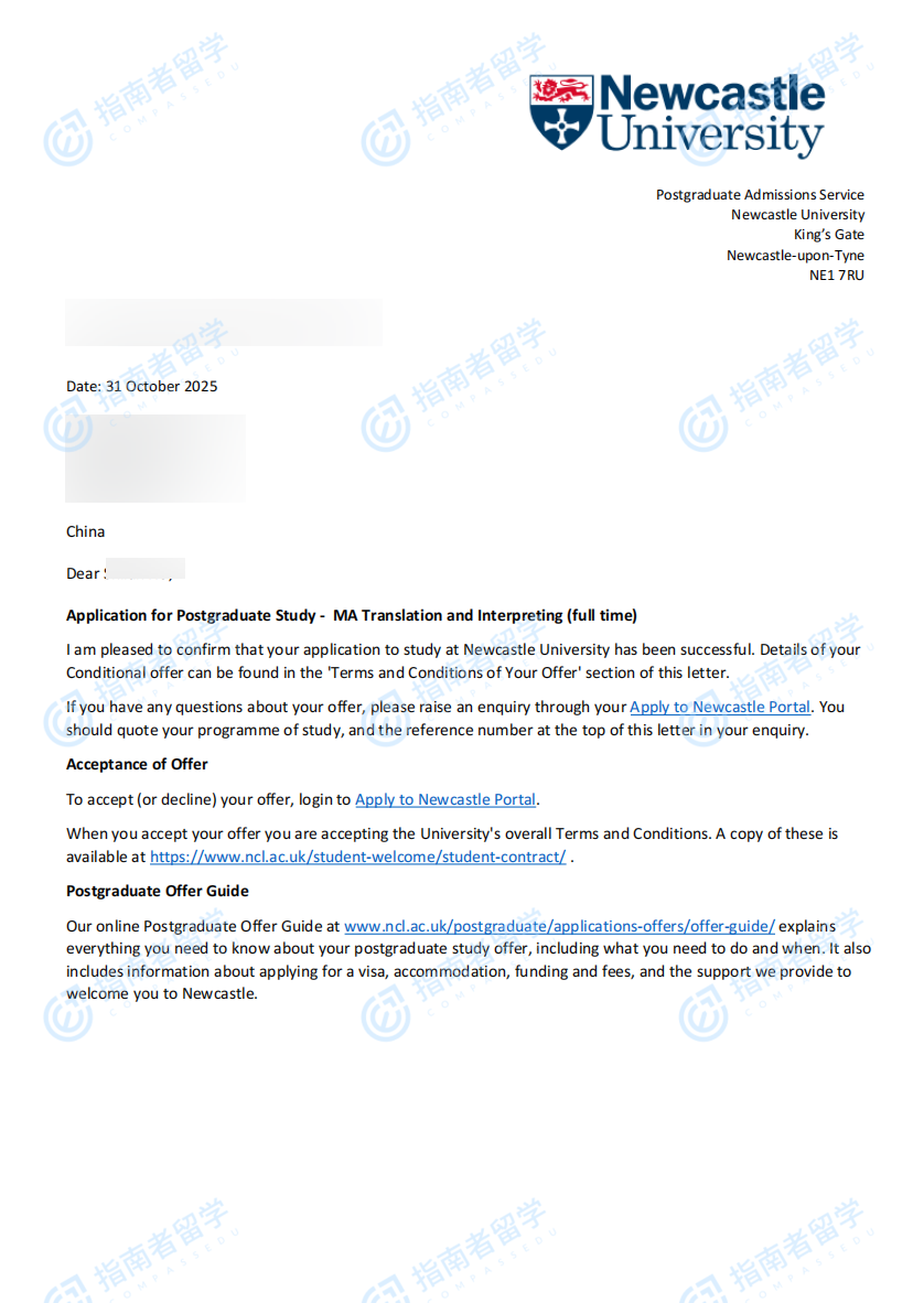 纽卡斯尔大学(英国)笔译与口译文学硕士(1年制)研究生offer一枚