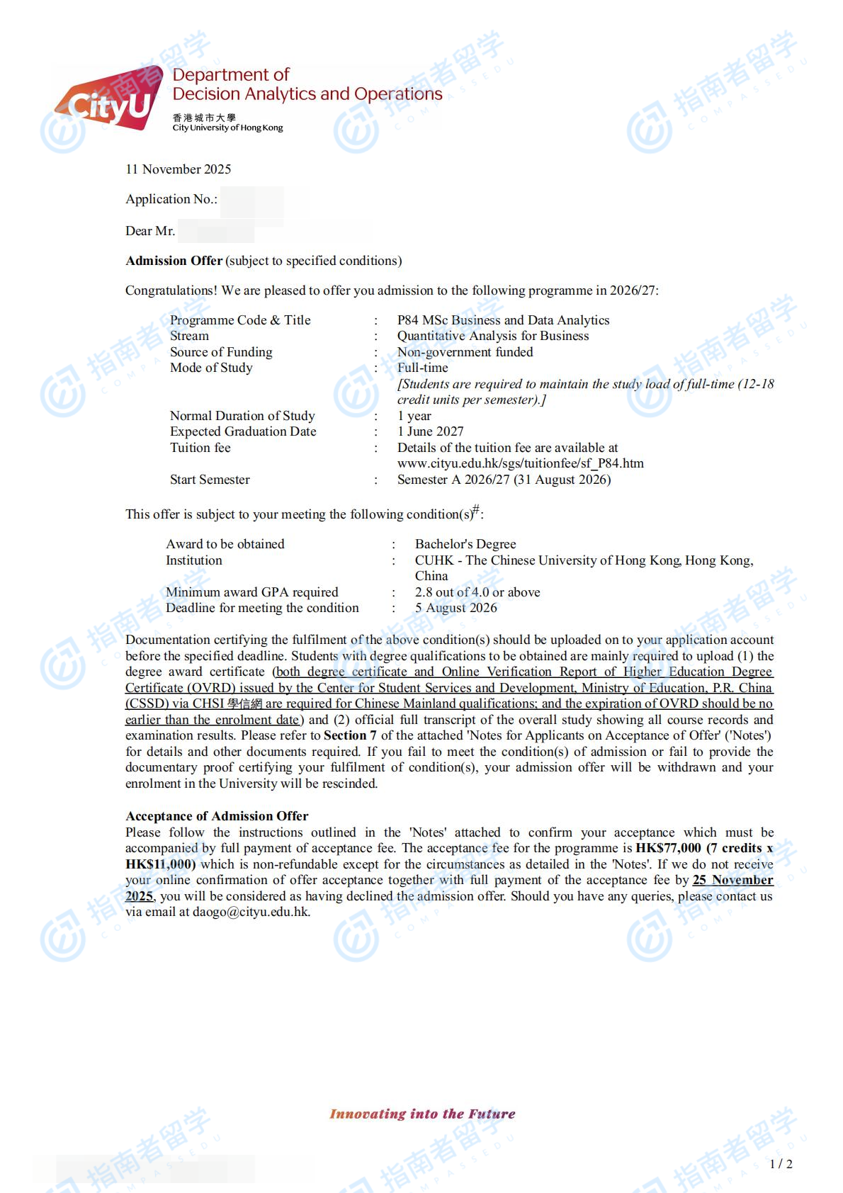 香港城市大学商业及数据分析理学硕士研究生offer一枚