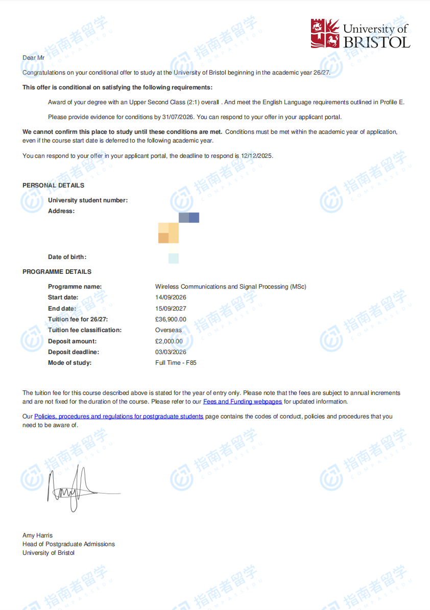 布里斯托大学无线通信与信号处理理学硕士研究生offer一枚