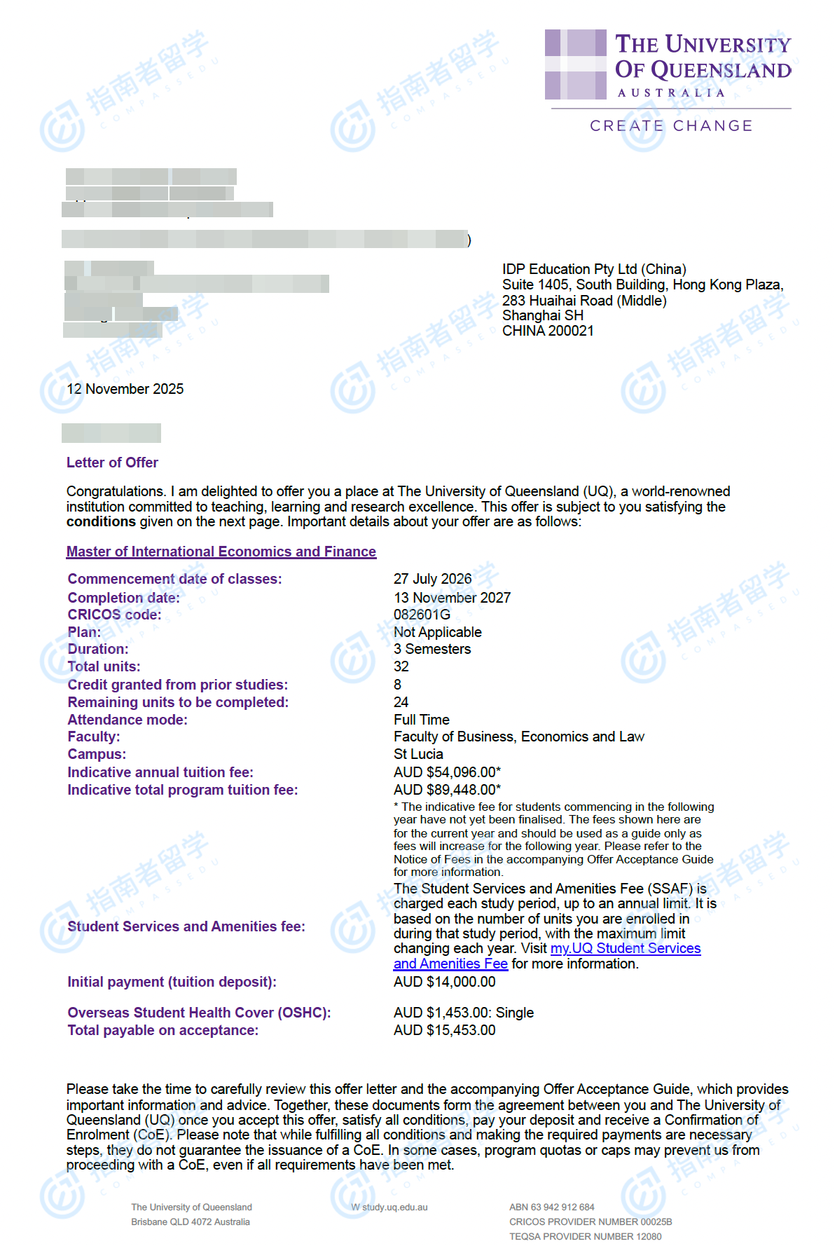 昆士兰大学国际经济与金融硕士(1.5年制)研究生offer一枚