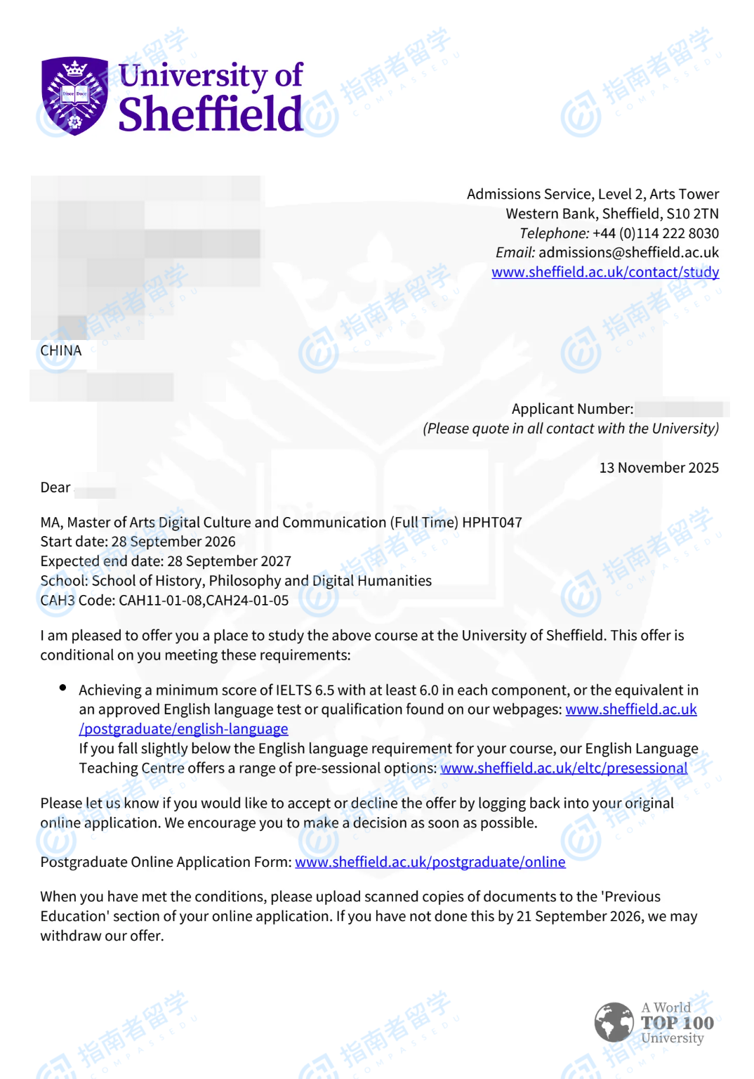 谢菲尔德大学数字文化与传播硕士研究生offer一枚