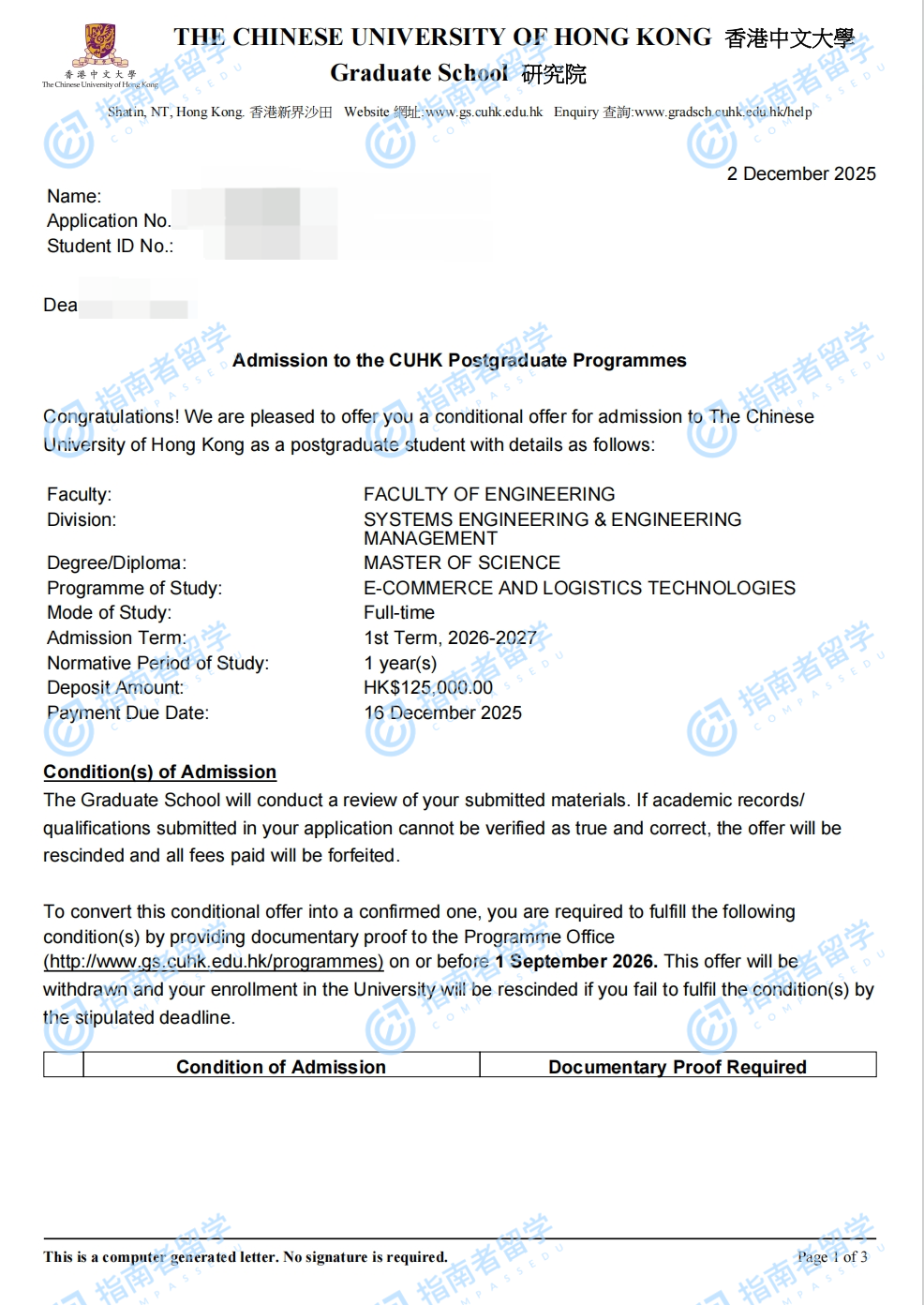 香港中文大学电子商务与物流技术理学硕士研究生offer一枚