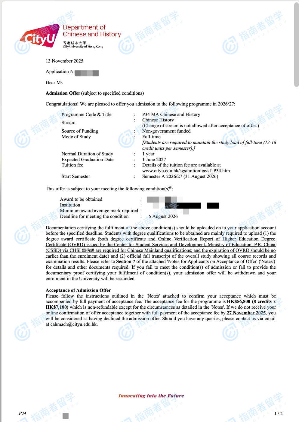 香港城市大学中国语言文学与历史文学硕士研究生offer一枚