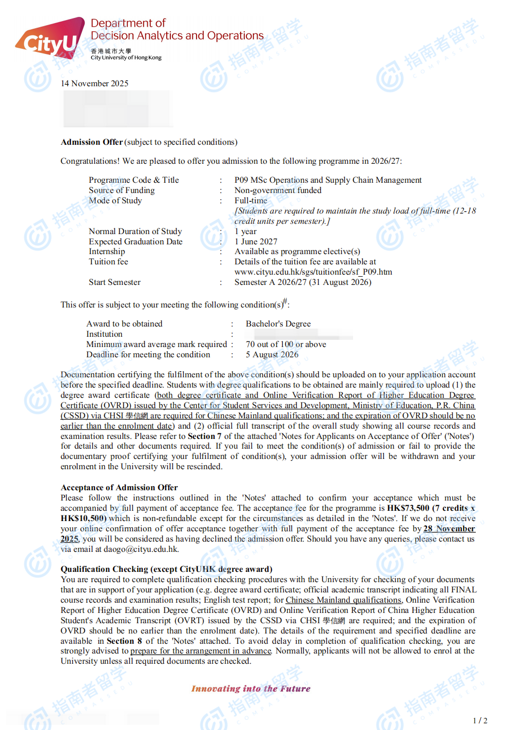 香港城市大学营运与供应链管理理学硕士研究生offer一枚