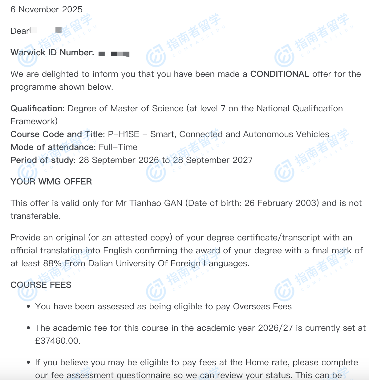 华威大学智能、互联与自动驾驶汽车理学硕士研究生offer一枚