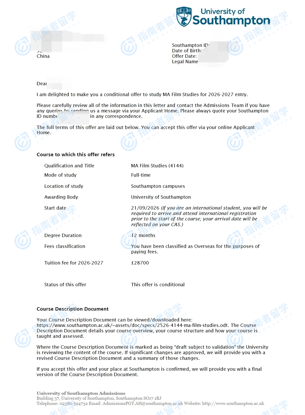 南安普顿大学电影研究文学硕士研究生offer一枚