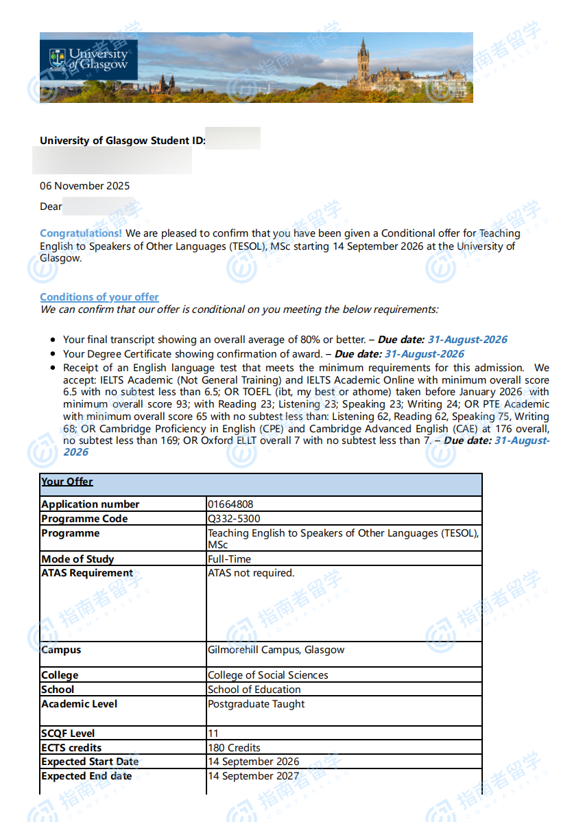 格拉斯哥大学对外英语教学理学硕士研究生offer一枚
