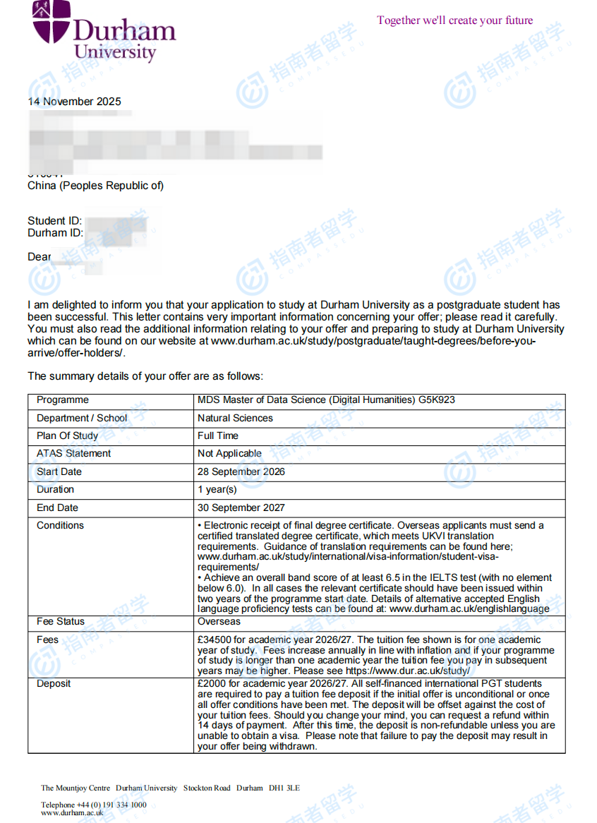 杜伦大学数据科学(数字人文)硕士研究生offer一枚