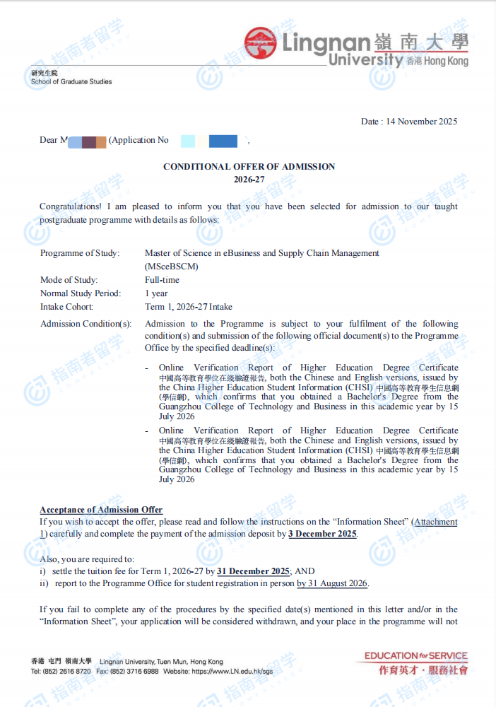 香港岭南大学电子商务与供应链管理理学硕士研究生offer一枚