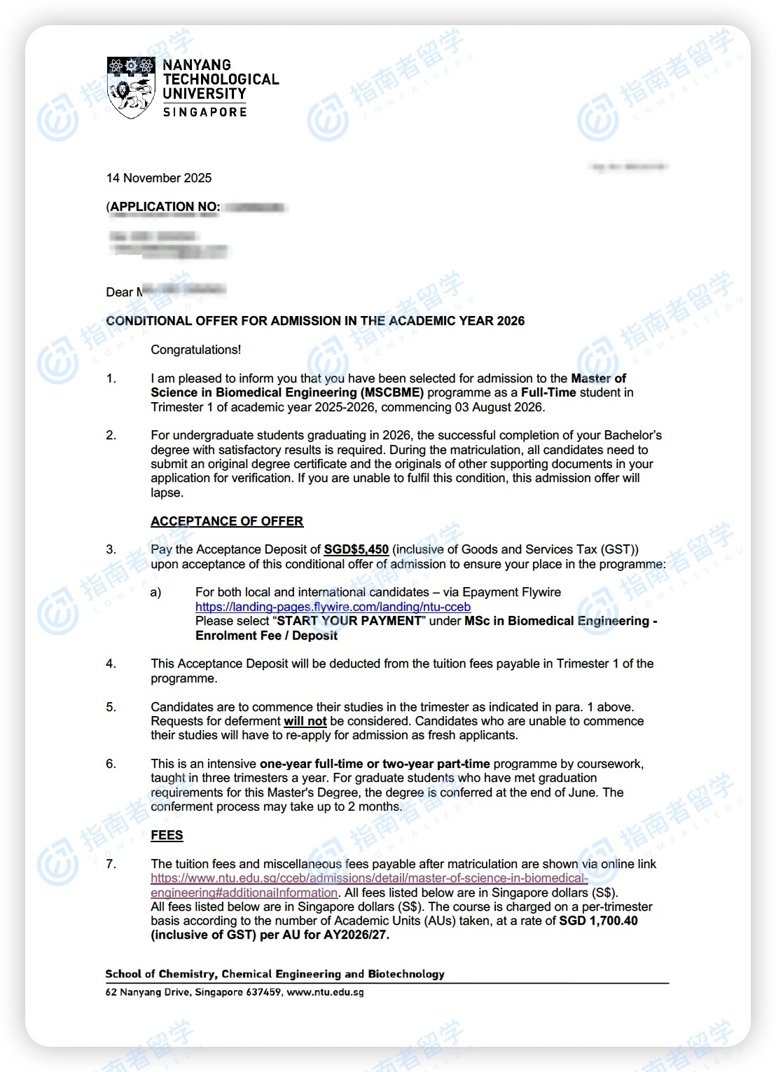 南洋理工大学生物医学工程理学硕士研究生offer一枚