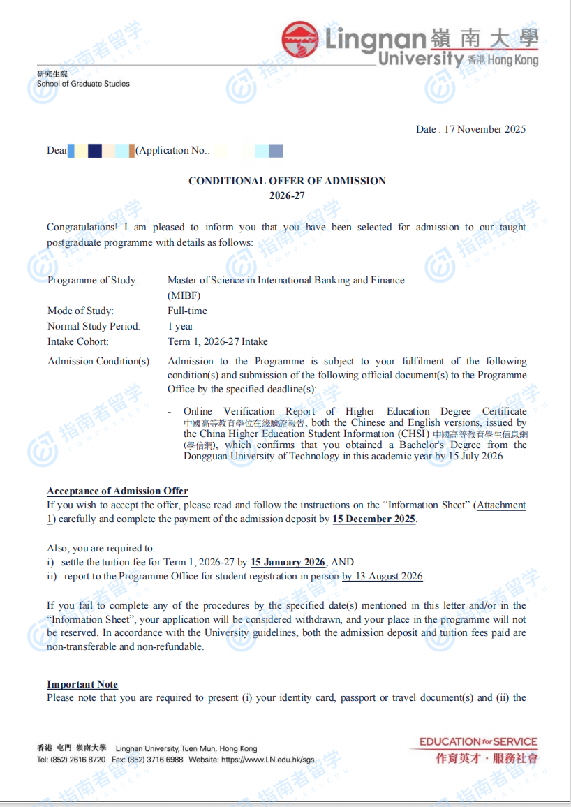 香港岭南大学国际银行与金融理学硕士研究生offer一枚