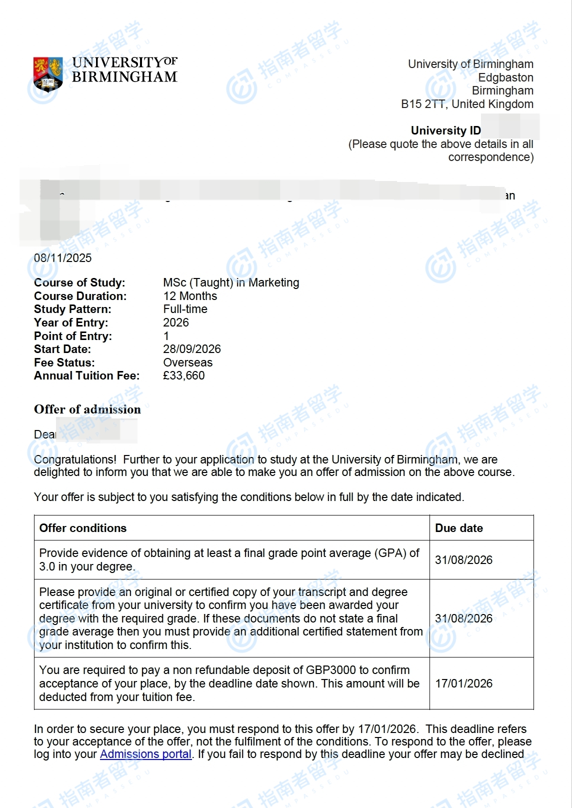伯明翰大学市场营销理学硕士研究生offer一枚