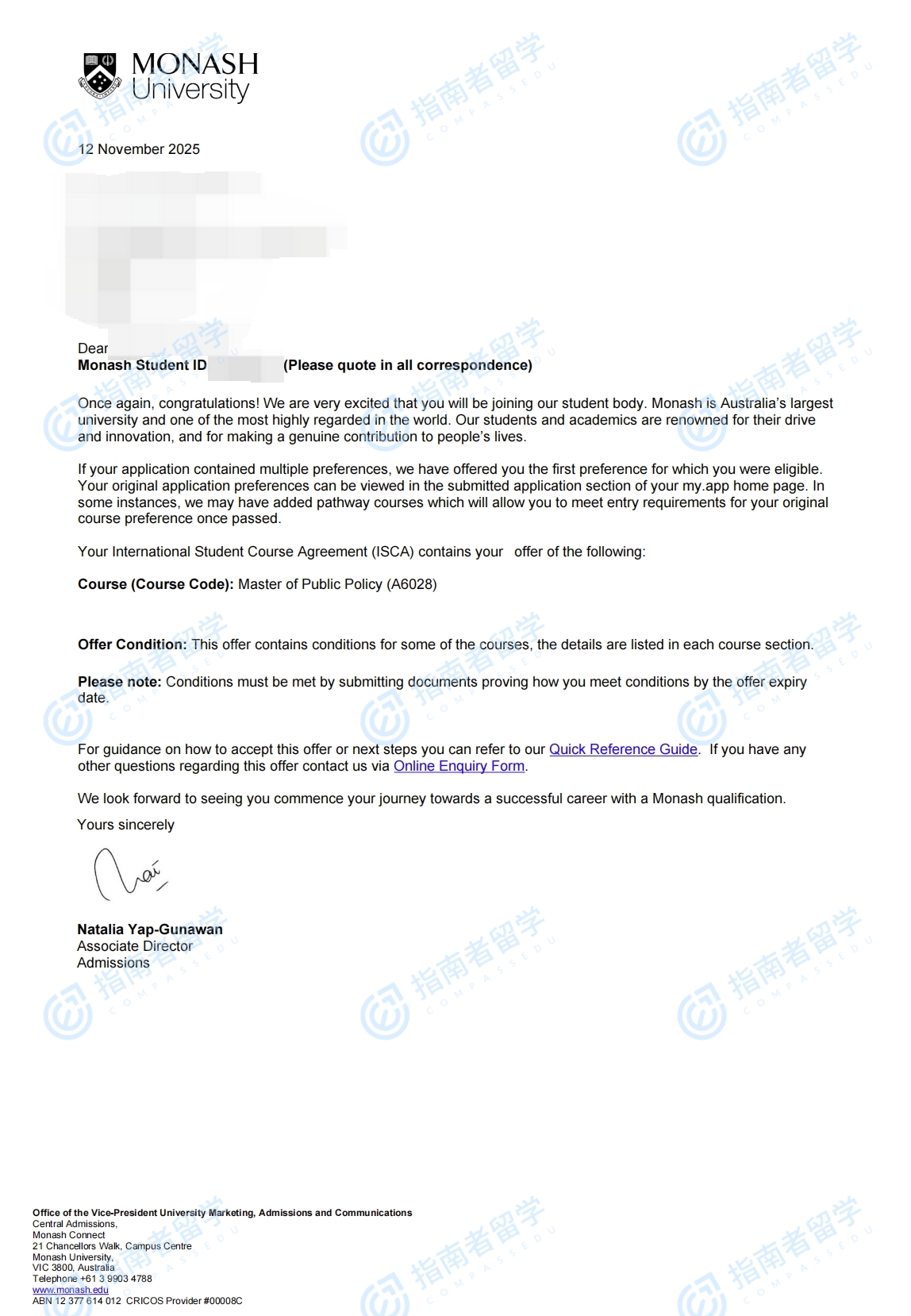 莫纳什大学公共政策硕士(1.5年制)研究生offer一枚