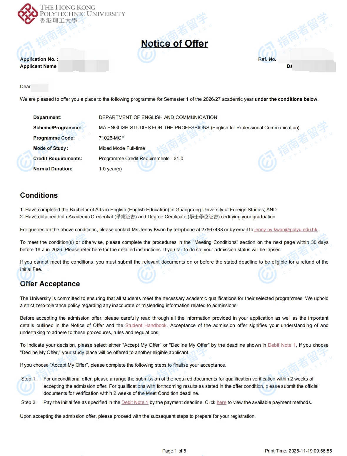 香港理工大学专业英文文学硕士(专业英语)研究生offer一枚