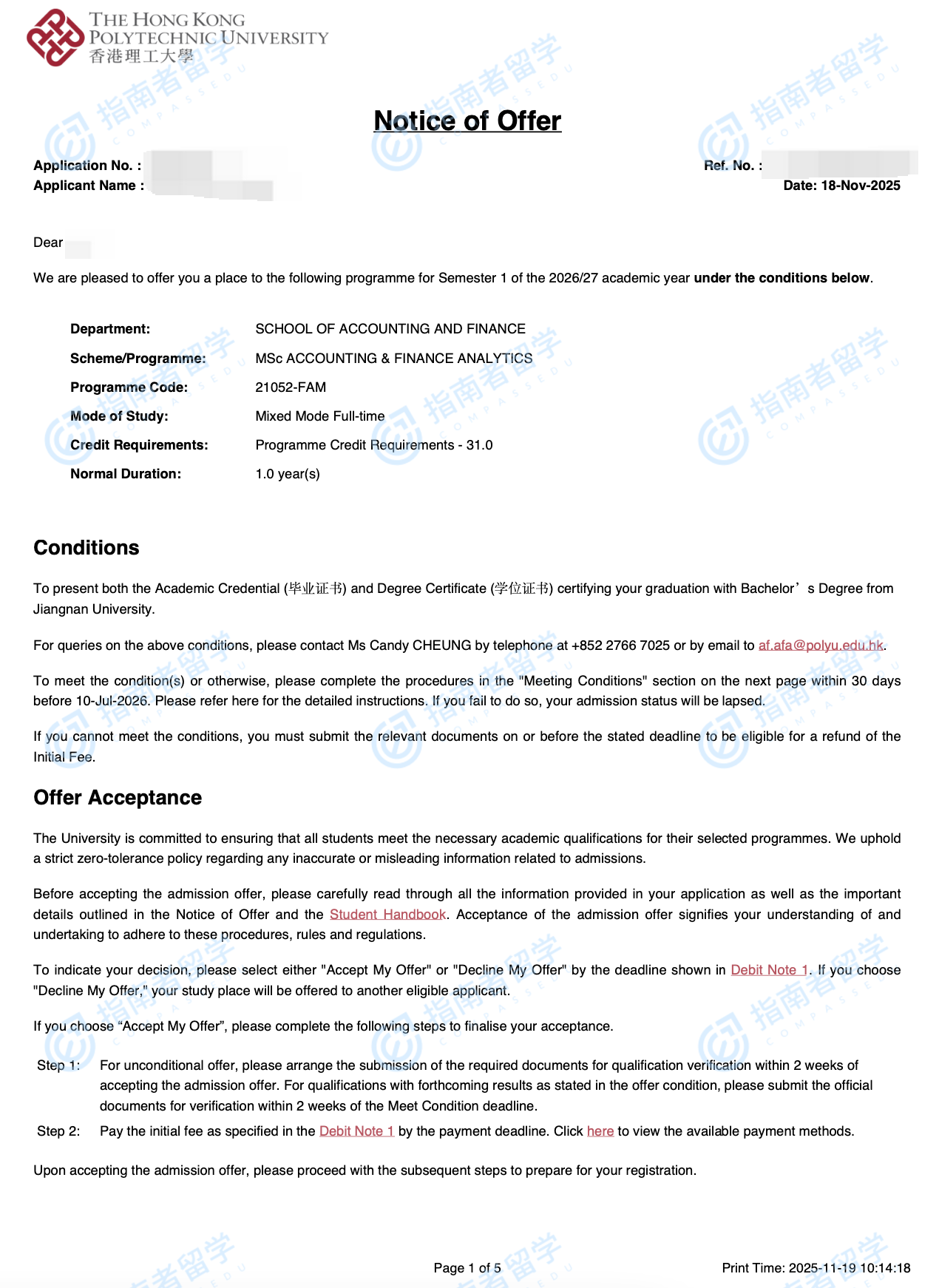 香港理工大学会计及金融分析理学硕士研究生offer一枚