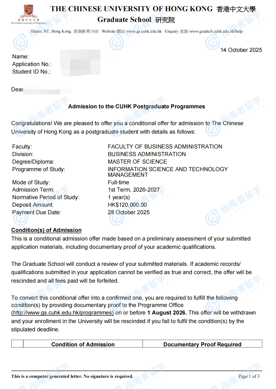 香港中文大学信息科学与技术管理理学硕士研究生offer一枚