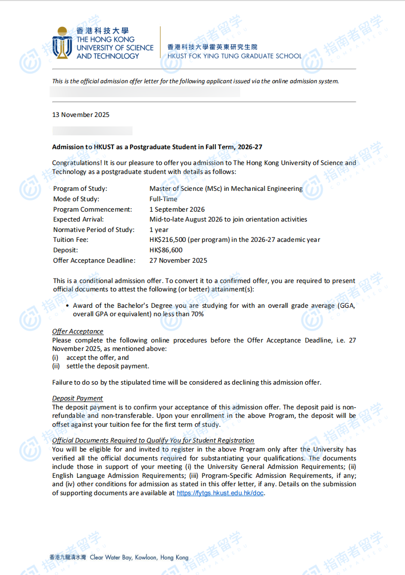 香港科技大学机械工程理学硕士研究生offer一枚