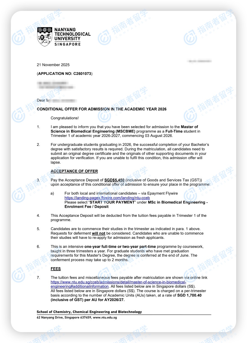 南洋理工大学生物医学工程理学硕士研究生offer一枚