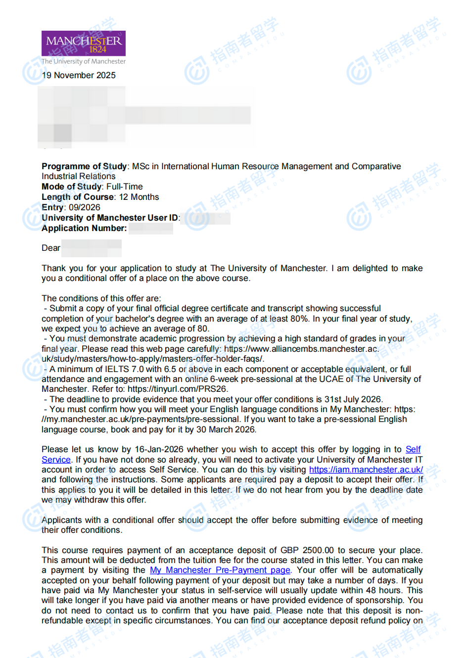 曼彻斯特大学国际人力资源管理与比较劳资关系理学硕士研究生offer一枚