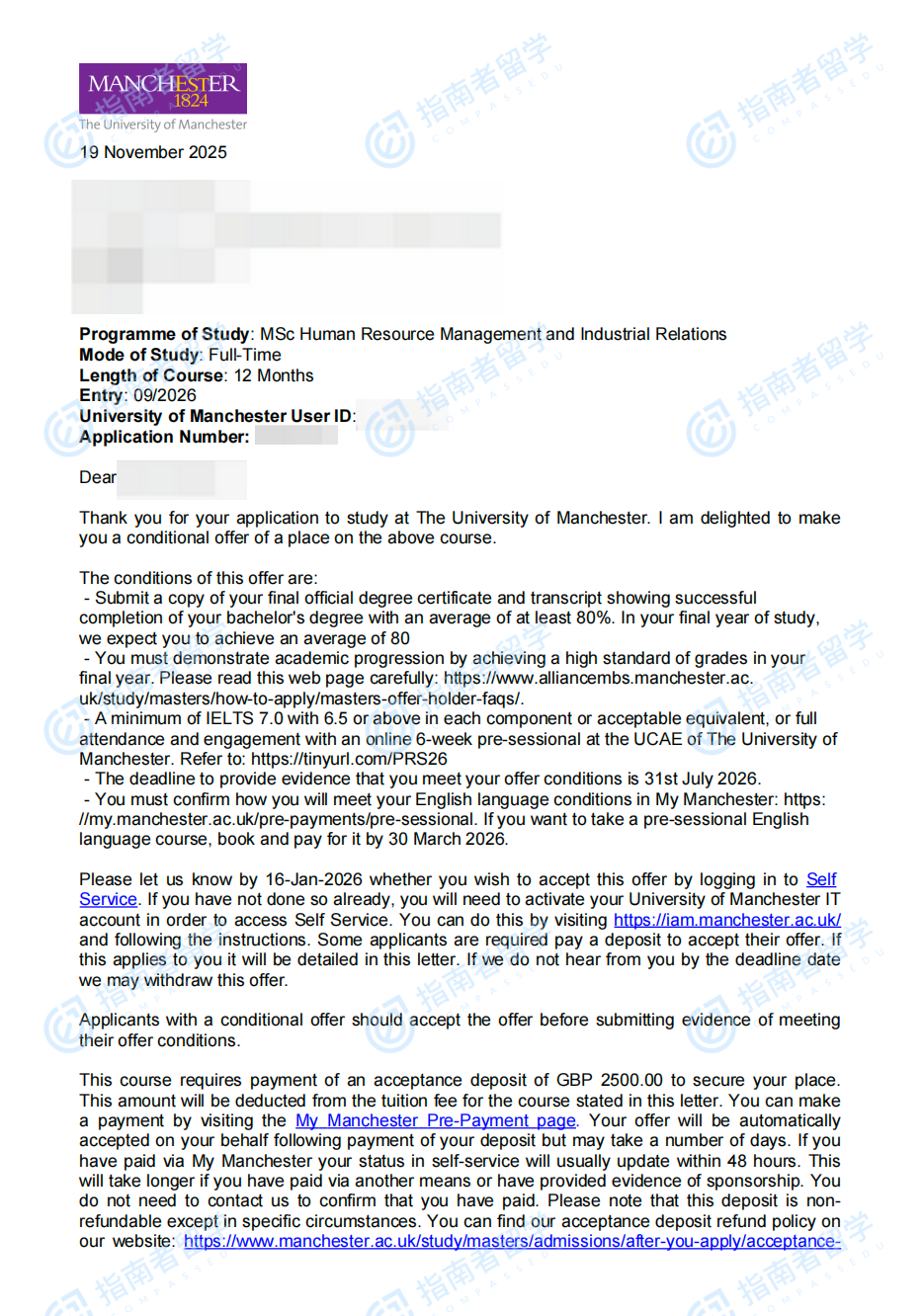 曼彻斯特大学人力资源管理与劳资关系理学硕士研究生offer一枚